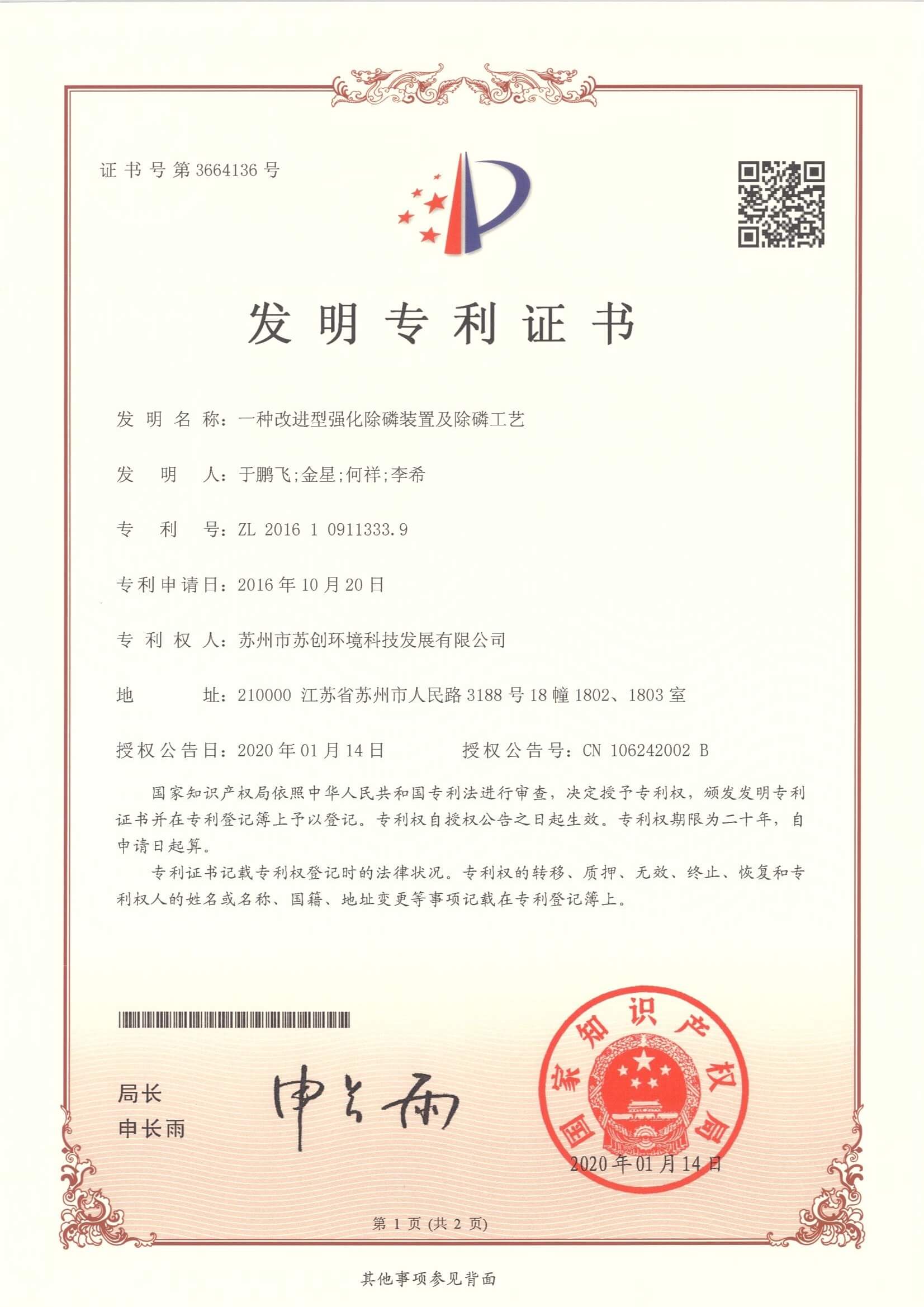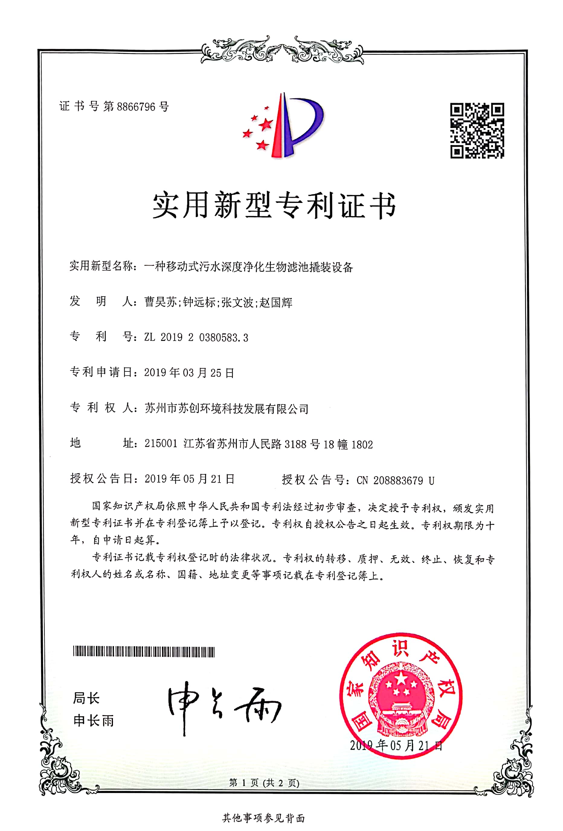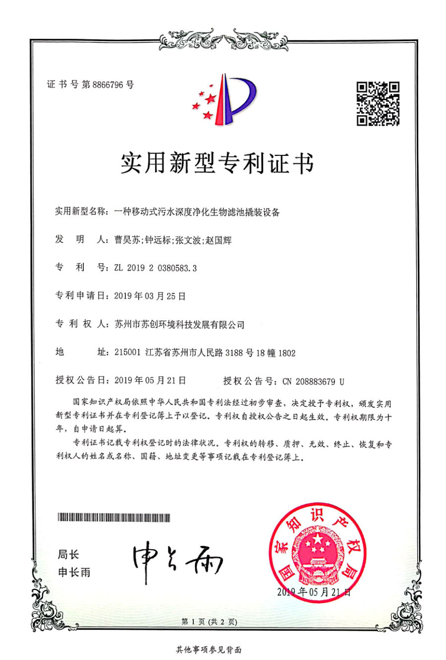 磁分離+反硝化+曝氣生物濾池一體化裝備 采用磁沉淀和曝氣生物濾池相結合的水體凈化工藝蘇創環境 · 專利與榮譽成果
